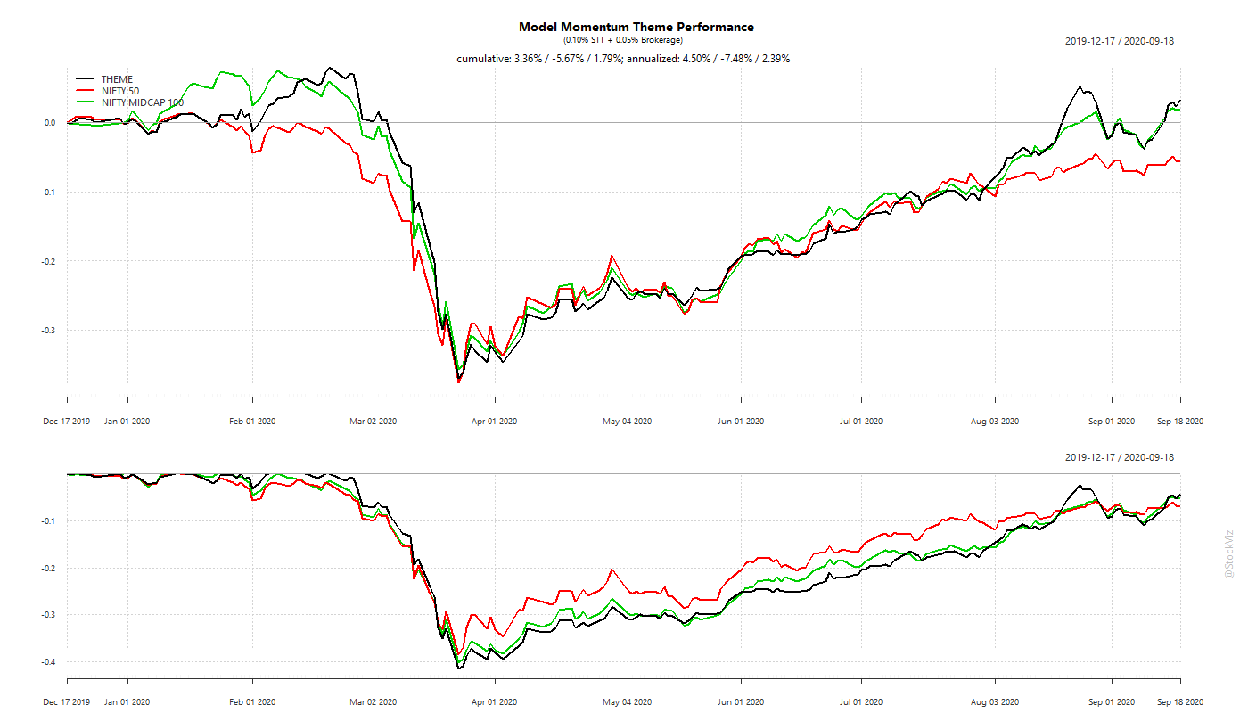 The Indian version of the Factor Momentum strategy is a mixed bag. Since it averages over a longer time-period, it is (understandably) slow to respond to sudden events. The dive during the Corona Cliff and subsequent performance is inline with the back-test. Thus far, it has marginally out-performed NIFTY 50 and MIDCAP 100 after STT and brokerage and we remain optimistic about its future.