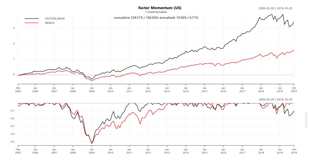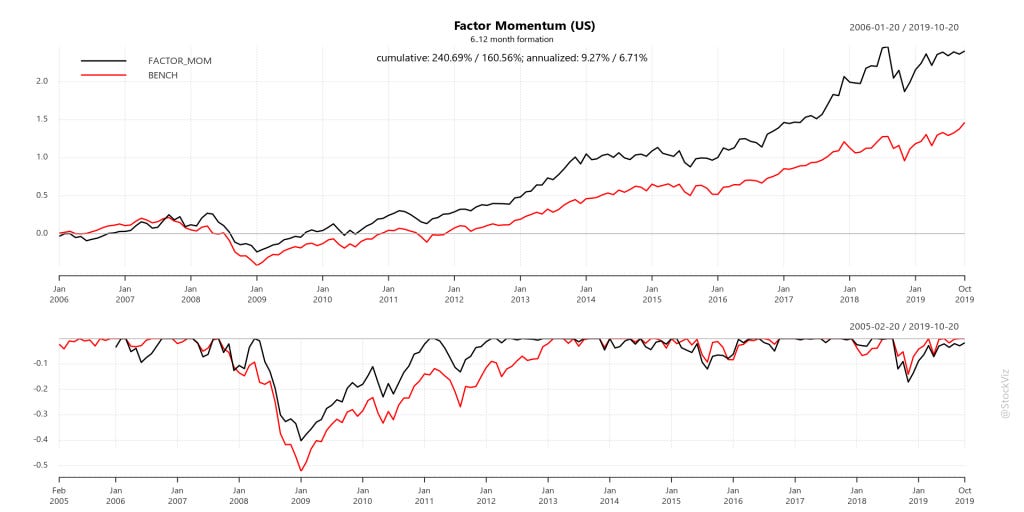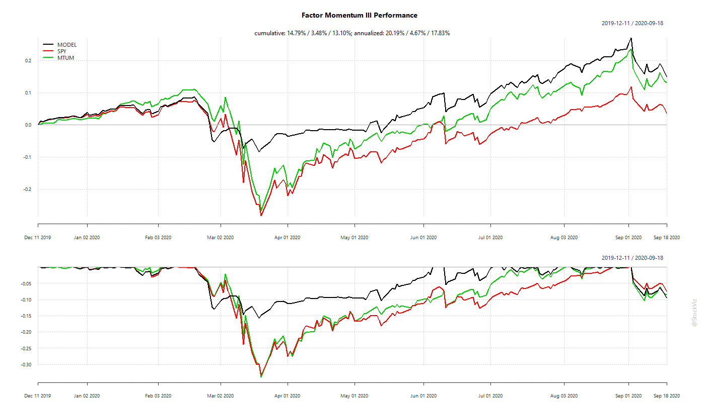 The Factor Momentum strategy beat plain-vanilla momentum (MTUM) and S&P 500 (SPY). It also avoided the Corona Cliff in March 2020.